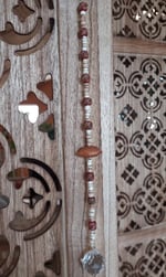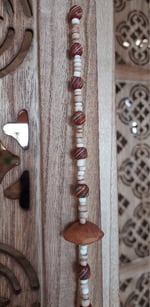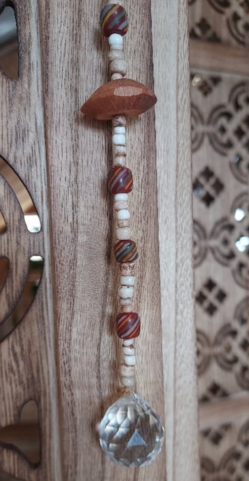 This suncatcher is made from African,handpainted, burgundy glass beads, tan beads and a brown bone bead statement piece. The clear glass prism on the bottom creates rainbows in your space when hung in the direct sunlight.