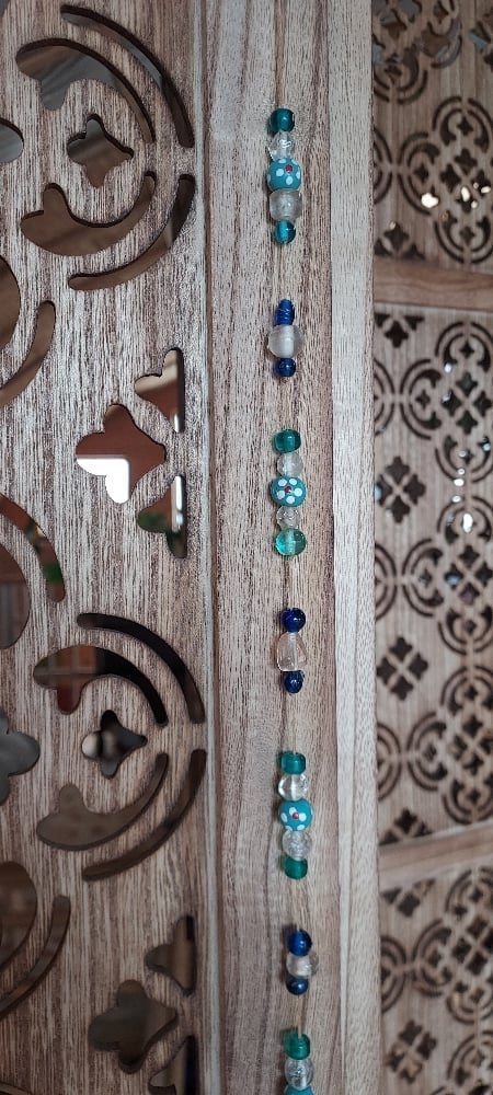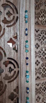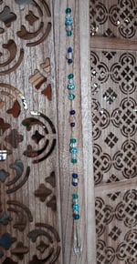 This beautiful suncatcher is made from glass beads and a crystal prism. A variety of blues makes for a beautiful hanging for your home or office space. When hung in direct sunlight it will cast rainbows making for a relaxing ambiance.