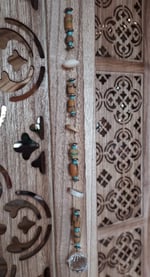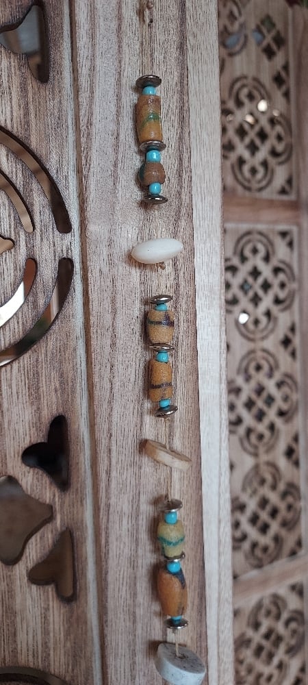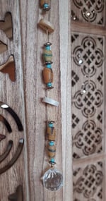 This beautiful suncatcher is made from African glass beads,, bone beads, metal spacers and a crystal prism. When hung in direct sunlight this will cast rainbows in the room making for a lovely ambiance.